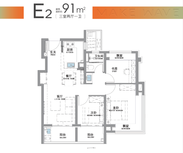 “南向双阳台+南北双飘窗”,构筑真3房户型!