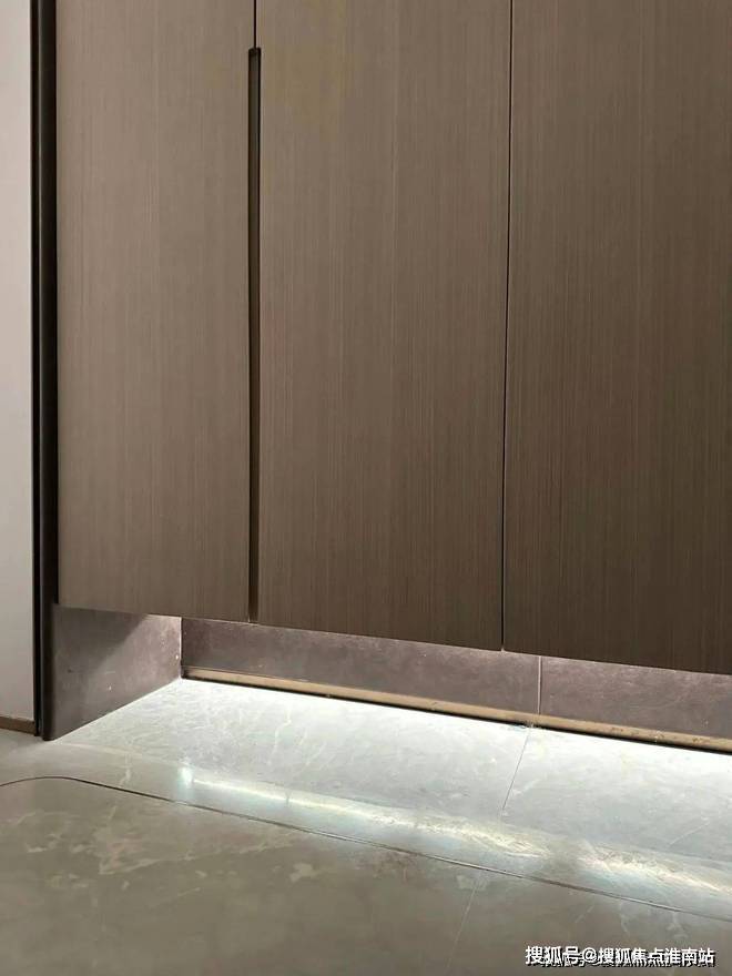 鞋柜下方做了 悬浮处理,同样也是 内嵌灯带,这里灯光的角度还会再调整,因为灯光映射在大理石地面上,要显得尽量柔和不刺眼;同时,鞋柜下方可放拖鞋, ✨✨缦云上海售楼处电话:400-891-9910✔️还能放扫地机器人,便于日常清扫打理。