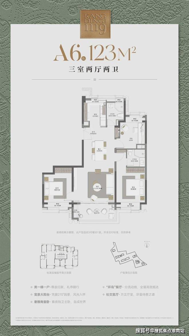 建筑面积约123㎡三房户型,飞机式布局,一镜到底的LDKB长厅,尽显隐贵静安风范;