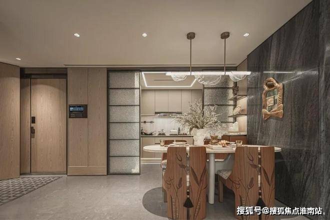 采用米黄色温润石材,巧妙模拟风的流畅形态,营造出既庄重又舒适的归家氛围。这片宽广的流线型石墙在柔和灯光的映衬下,更显璀璨夺目,而风雨连廊的灯带设计,更添一份尊贵仪式感。