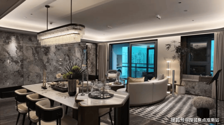 客厅以整面雪山蓝岩板打造电视背景墙,地面采用1.8米×0.9米大规格地砖密拼,营造浑然一体的奢华氛围。