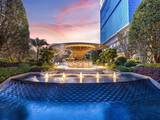 而大华星曜不仅打造了具有曲线美感的树池,还在水景底部铺了数百片蓝钻瓷片,全角度弧形定制,水刀切割,用金属线条勾勒出水波的形状。