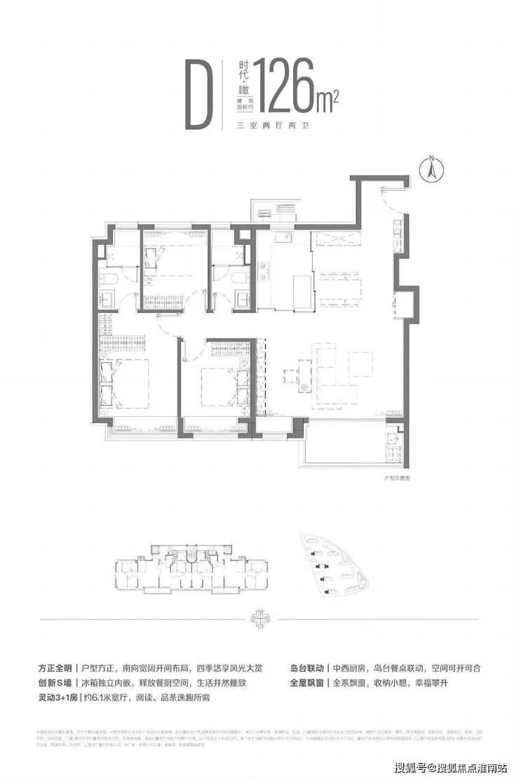 建面约126平的三房两厅两卫,在这个面积上做横厅大三房, 整体的空间感和尺度感很不错,适合改善型家庭。