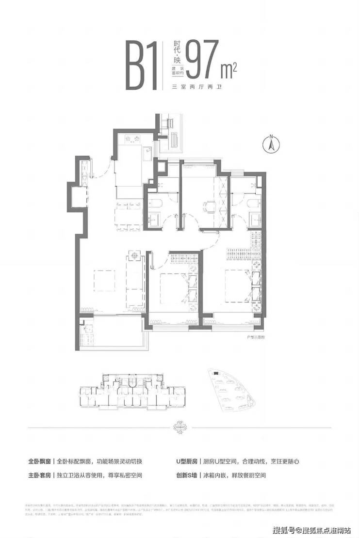 建面约97平的三房两厅两卫,在89户型基础上多了一个卫生间, 450-500万级别功能性更强。