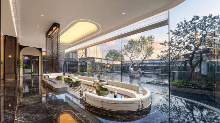 穿过华贵门廊,一境登门庭入府,超阔的接待前场是贝母形大理石地面铺贴纹路,头顶是透光云石弧形穹顶,正前方是皇室杈木影壁,接待台背部静置着“蓝翡翠”奢石背景屏风,以及与下沉水院一体的“三生石”造景,处处流露着优雅的艺术场域。