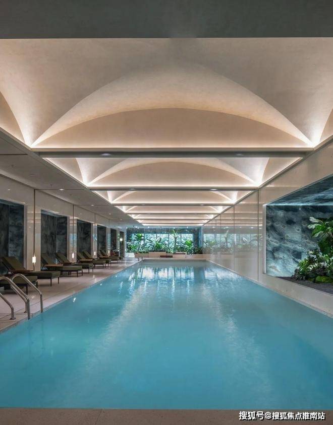 植物园泳池放在了2楼,选用了皮革面的绿色石材,营造一种树影斑驳的感觉.里面的绿植不是装饰,都是鲜活的、精心照养的.