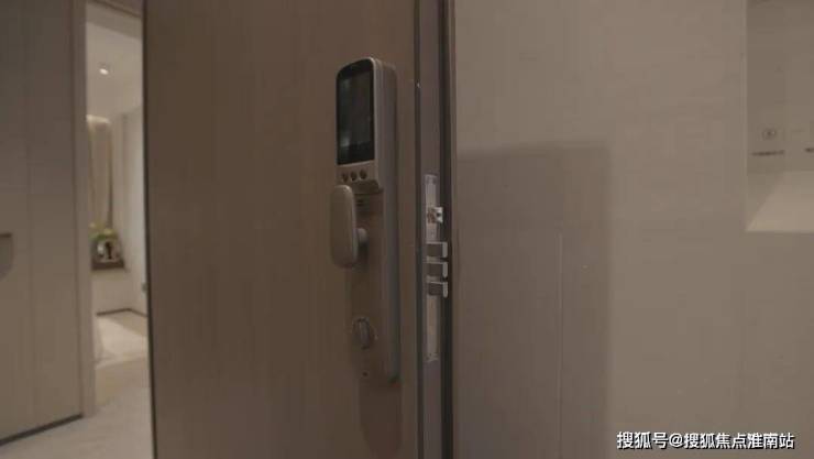 换好鞋,起身可以看到入户门旁配置了窄边框可视对讲,灰色高标肤感开关面板,三合一温控面板,未来可以通过它远程调节灯光,新风,中央空调,地暖,实现智能生活,到家就能享受舒适的居住状态。