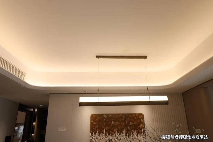 ● 客餐厅:客餐厅地面同样采用了750*1500的大砖,电视背景墙采用浅色大面岩板。顶部采用弧形石膏板吊顶+四边反光灯槽(圆弧角)+吸顶灯+磁吸轨道灯,使客厅空间在视觉上显得更加宽敞。