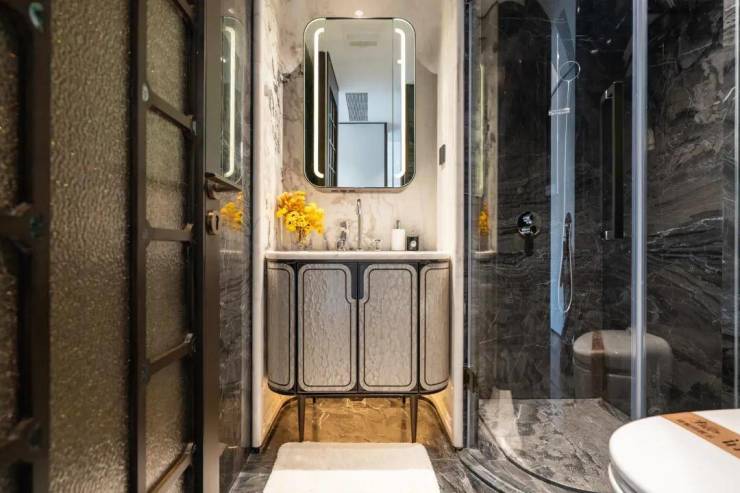 区别于常规豪宅仅以奢石作为点缀,绿城黄浦ONE在多个空间大手笔地采用了整体铺贴的设计