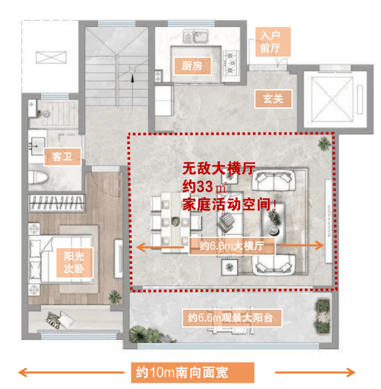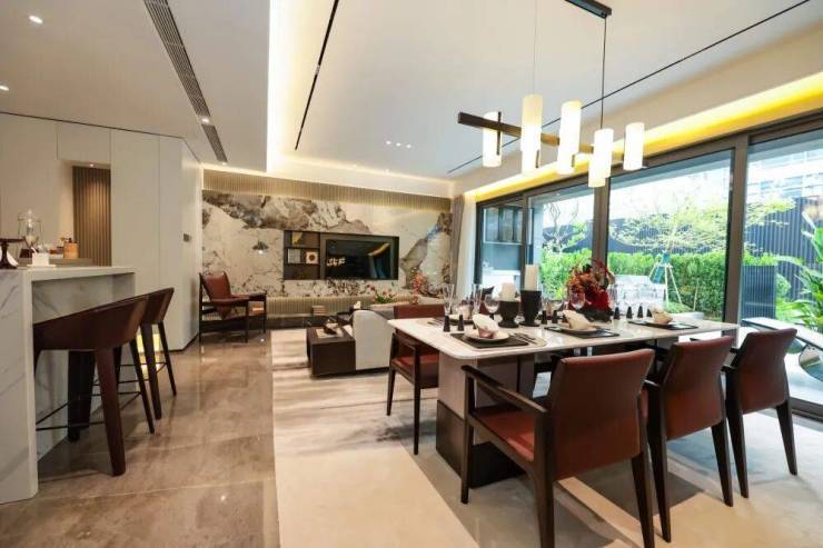 一层大花园,自由延伸,室内南向打造为餐客一体的约6.6米横厅,奢华大气,约33㎡大横厅构成家庭活动中心,特别适合开个home party,电影《小时代》中的奢华感觉一下就被“调”出来了。