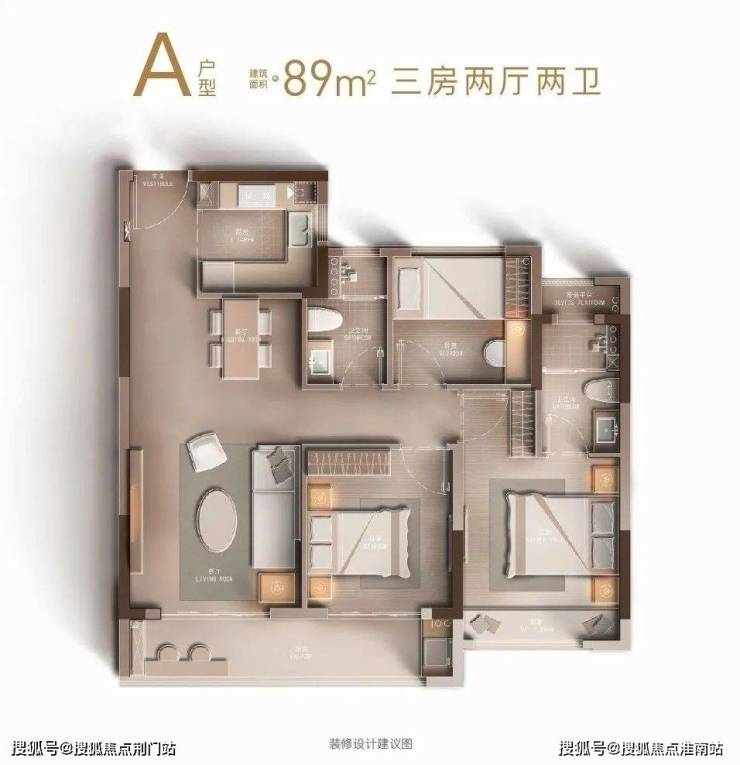 建筑面积约89㎡户型做到三房两厅两卫,三开间朝南,主卧还配有独立卫生间。南向建筑约6.4米阳台。还有开放式的餐客厅一体化设计,舒适宽敞。