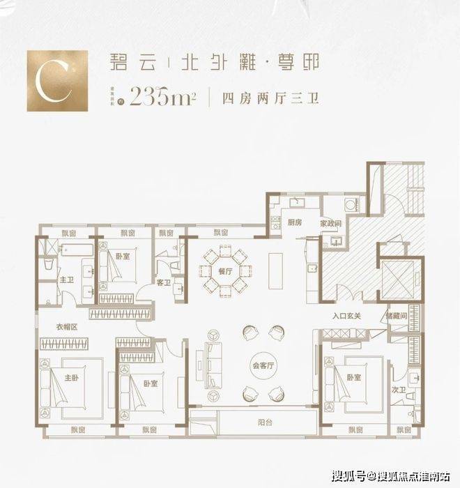 建面约235㎡4房2厅3卫:约7米超大横厅,三卧室朝南,LDKB一体格局,约60平社交会客厅,全屋飘窗通透采光、大尺度景观阳台,超30平至尊套房主卧、双南套房、全明三卫设计、高规格精装标准。