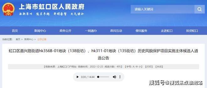 2022年12月23日 虹口区人民政府网发布了关于嘉兴路街道hk356B-01地块(138街坊)、hk311-01地块(135街坊)历史风貌保护项目实施主体候选人遴选公告。