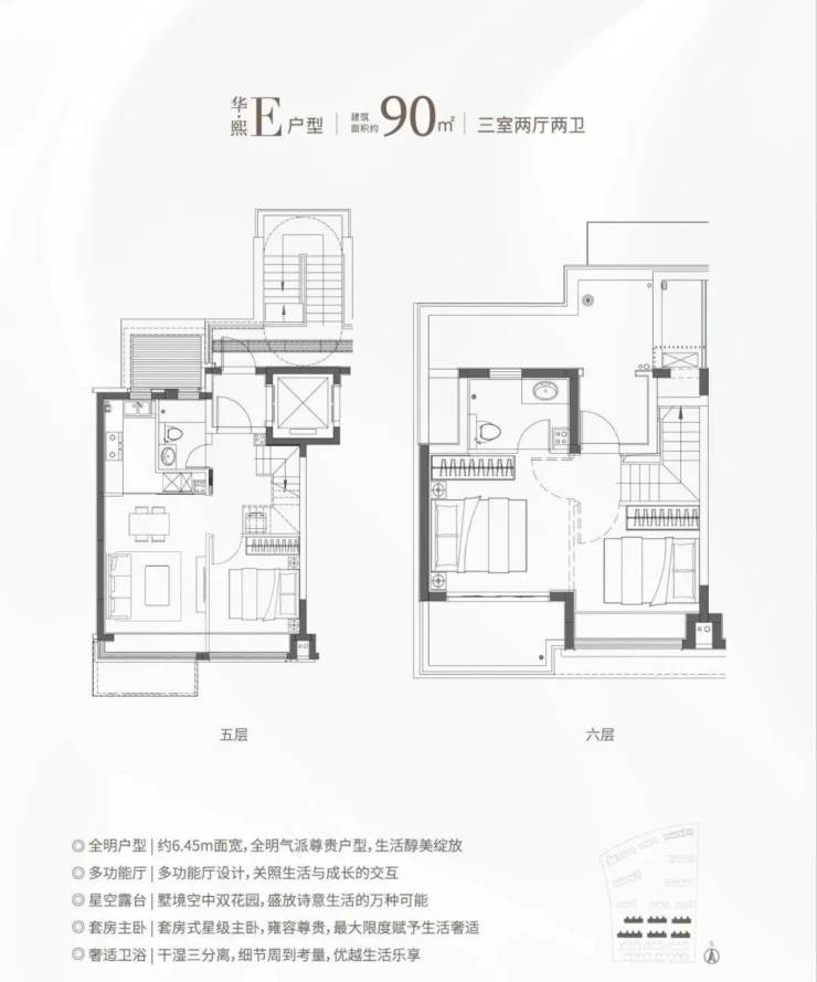 除了高层户型,项目还有建面约90-136㎡叠墅户型。叠加的优点非常多,相较于大平层,叠加区域分割清晰,会客区、休息区等可以明显区分开,互不干扰。同时,居住的私密性强,给到墅居的空间感,得房率相较于高层产品也更高。作为居住业态的高阶形态,舒适度和仪式感也更胜一筹!