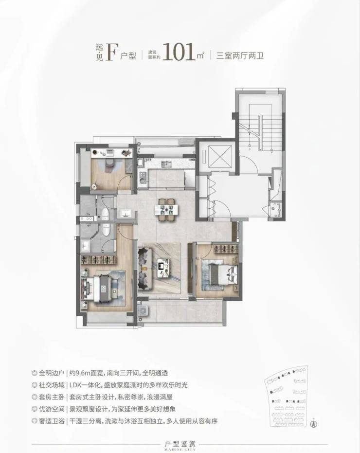F户型:远·见 建筑面积约101㎡,三房两厅两卫