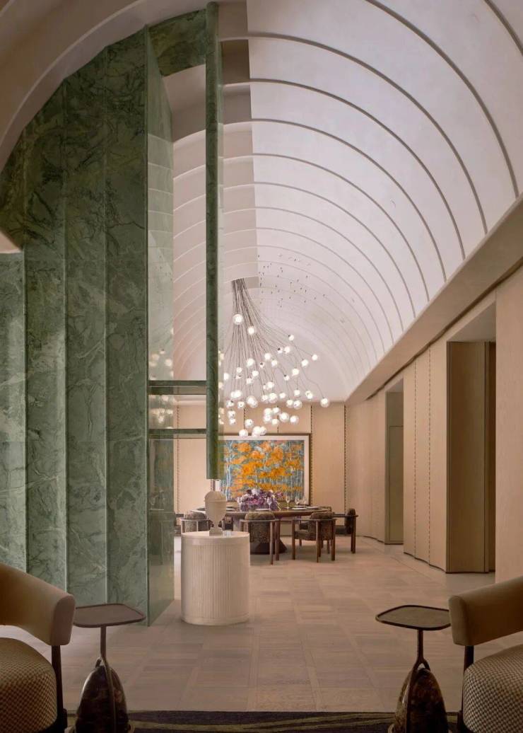 地下一层规划沉浸式主题会所,囊括行政酒廊、棋牌室、红酒雪茄吧、茶室、恒温泳池、SPA馆、健身房、瑜伽室和私宴厅等功能空间。其中270°观景泳池以45°探入庭院,业主在游泳时就可以无界欣赏下沉庭院跌水景观。