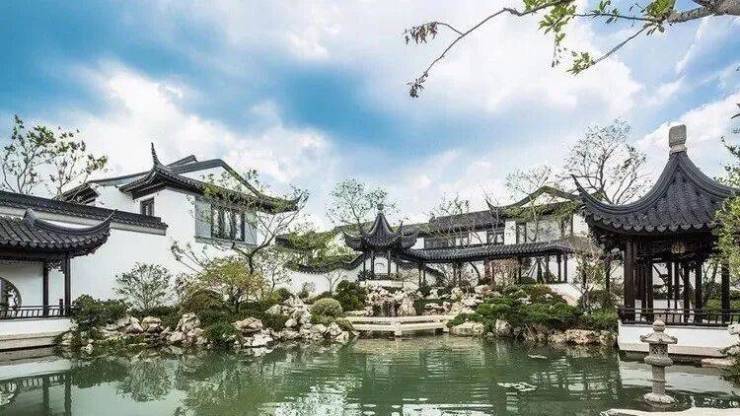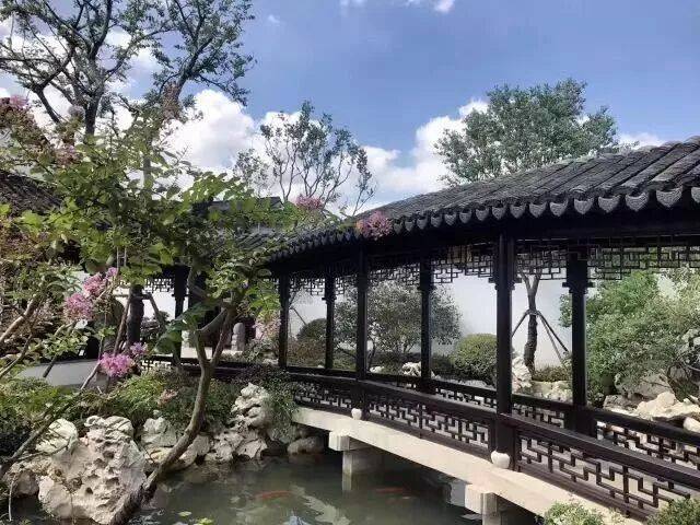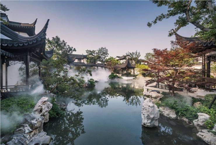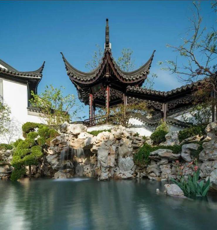 中式园林是最纯粹最理想的精神皈依之所。进入园林庭院,古朴有致,瘦漏透皱的太湖石下一方清泉涵韵其间,低头有池水如镜,抬头有瀑布如练,“水积必然龙有穴”,富贵因子已然埋藏于此。