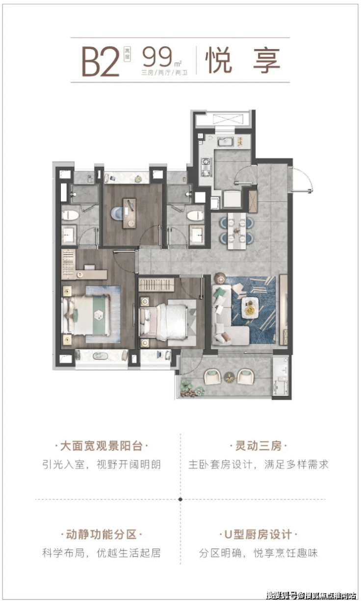 高层99㎡三房两厅两卫(中间套)样板间户型