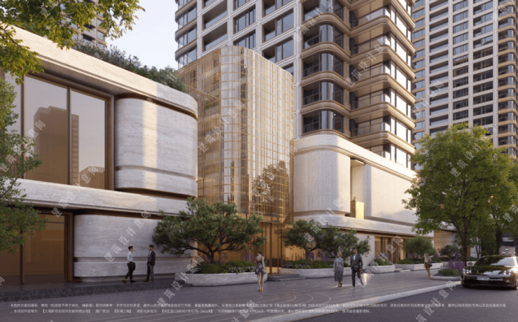 立面设计采用高奢商业街区的营造手法,既注重与周边环境的自然融合,又着力打造东安路沿线独有的精致奢感场域。石材肌理连绵起伏,形成丰富灵动的沿街天际线,更巧妙嵌入自然生态,未来出门就能citywalk。