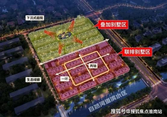 北侧4层叠加别墅区以下沉庭院为中心,增强社区邻里的互动交流体验;南侧3层联排别墅区采用“一环两轴”规划布局,南向直面天然河道。