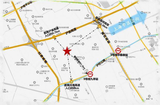 地铁:本案直线距离9号线九亭站1.5km,8 站直达徐家汇(约30分钟);
