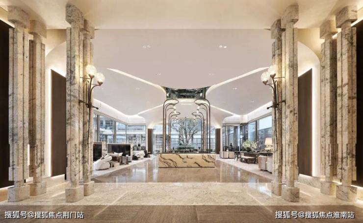 进入大门之后的庭院,用11根约5.3米高的弧形柱子,环绕拉升起了一个巨大的藻井空间,吊顶大手笔用了透光云石,柱顶嵌入了奢石;正中央更是种下了一株百年古桂树,冠幅有约7.6米,树高有约7米,一眼望去仿佛撑满了整片藻井天幕。