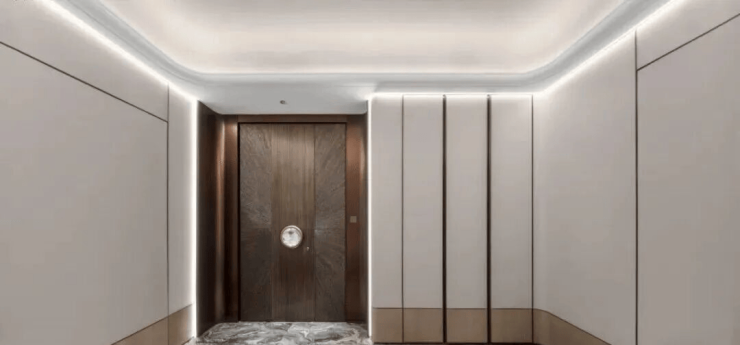 基于LDKB的布局,家人们共享整个空间,生活中的交互或社交时的沟通都可以轻松展开。餐厅背景奢石结合玄关金属隔断柜,一体化的形式下更添品质属性。