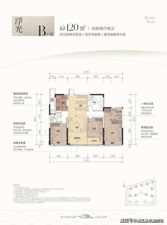 建面约120方B户型,四房两厅两卫: