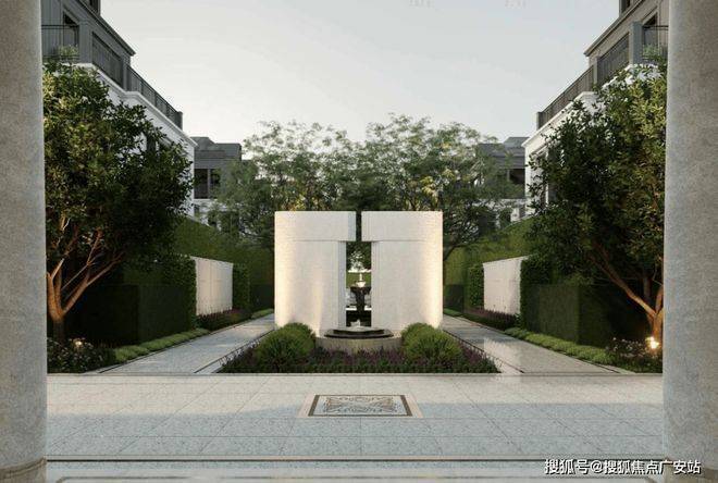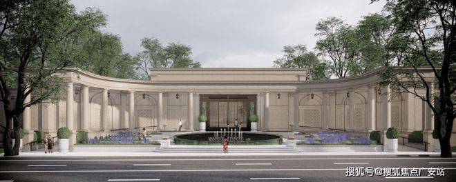 社区南门:约36米奢阔尺度,传承自凡尔赛宫的三泉林,对称仪制带来尊崇感,同时确保归家时人车分流,在保证安全的前提下,更带来从城市回归家园的心境转换。