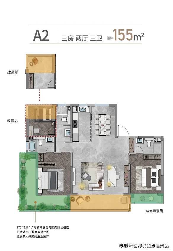 270°环景L形转角露台,近24㎡超大室外空间,既可以作为阳光露台,也能成为第二客厅,可以遛狗、撸猫、组织bbq、甚至露营看星空,日常起居不再局限于室内。