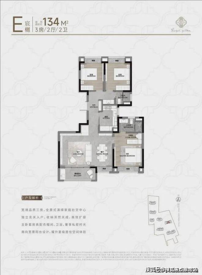 静安玺樾售楼处电话:400-881-8994(售楼处最新电话)上海静安玺樾官方电话:400-8818-994✔(官方售楼处预约看房热线)104㎡3户型特点:该户型多为楼栋的东边套,是一个观景户型.客厅连接270°阳台,视野出众.双卧朝南,阳光满溢.从次卫布局看,如果家庭人口较少,该户型还能做成双套卧.