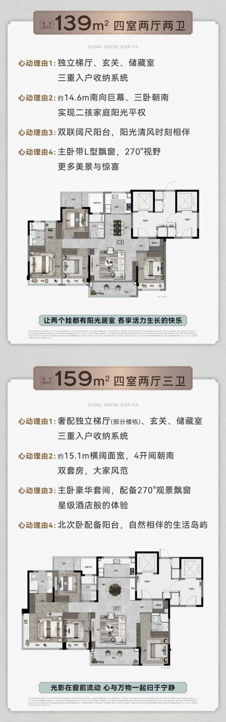 建面约139㎡类一梯一户设计,独立梯厅,归家更私密。约14.6米南向四开间,叠加南向双联大阳台,尽显优雅生活:LDKB大公区空间,互动性更强,四大卧室、三卧朝南,完美适配二孩家庭、三代同堂,子母套房,私密起居互不干扰。
