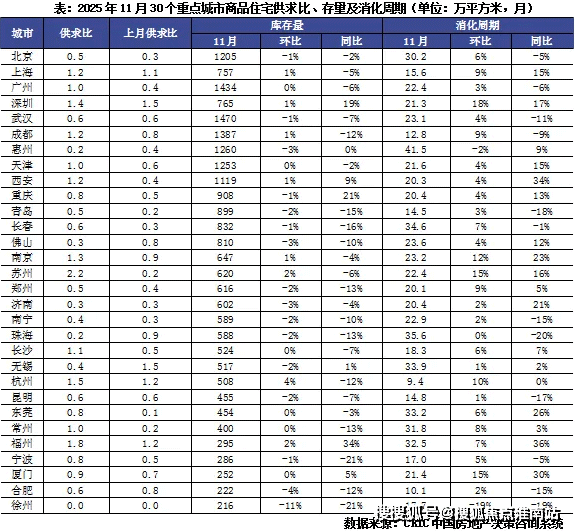 去化周期方面,因新房供应放量而成交持稳回落,因而30城11月整体供求比由上月的0.6增至0.82。