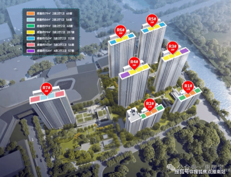 建面约99m3房2厅2卫,共计355套,99户型共计有3个,动静分离,三开间朝南,两梯四户,其中边套户型无连廊影响,中间套北向有连廊!