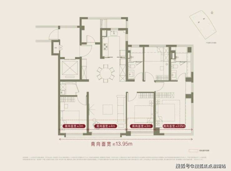 正常120㎡户型南向面宽在 9-10m,125㎡做到 13.4m,属于直接“越级”。