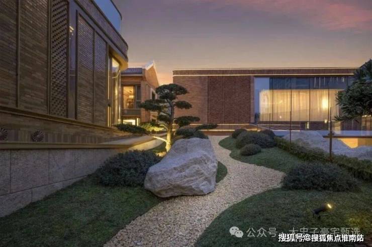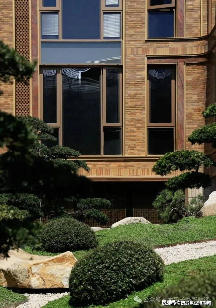 用昂贵的幻彩红奢石,把砖墙的直角做成了更优雅更昂贵的弧线圆角,与红砖形成了更丰富的肌理变化。精心镶嵌的金属线条,勾勒出了建筑的璀璨轮廓。入口处的弧形转角大幅落地玻璃窗,带来高奢酒店的氛围。站在街边,你已经可以看到庭院中的巍巍劲松探出一角,引发你步行归庭的情绪。