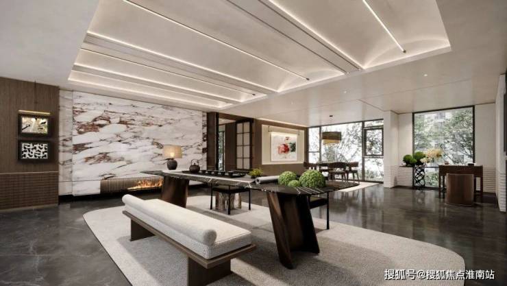 配合外部干挂铝板宋风立面,约16.8米南向面宽,大师手笔奢适空间尺度,超大面积全景落地玻璃窗设计,更加通透的视野,由内至外散发出美的哲思,让居所真正成为身心休憩地。