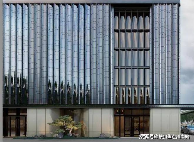 项目会所立面用的流光幻彩铝板,不同角度有不同颜色呈现,“缺点”就是昂贵;大堂的玻璃也很吸睛,用的半钢化夹胶反弯弧玻璃,半径仅为约600mm,施工难度大、成本高,只为更好的效果。