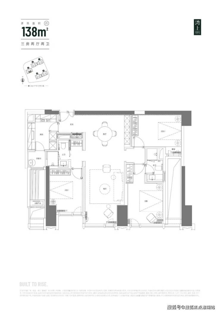 138㎡户型方正,在视觉上显得宽敞大气,功能分区合理,空间利用率高,三开间朝南,确保了室内充足的自然采光。主卧套房设计,全屋配置了充足的收纳空间,并通过设计做到了三个房间与两个卫生间的全明,为居住者提供了更为舒适的生活体验。