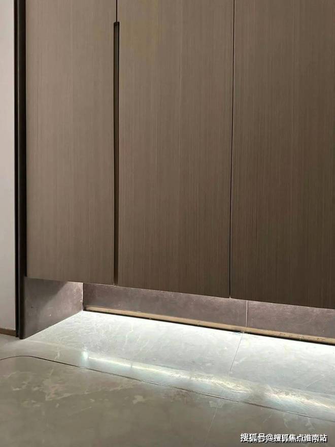 鞋柜下方做了 悬浮处理 ,同样也是 内嵌灯带 ,这里灯光的角度还会再调整,因为灯光映射在大理石地面上,要显得尽量柔和不刺眼;同时,鞋柜下方可放拖鞋,还能放扫地机器人,便于日常清扫打理。