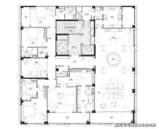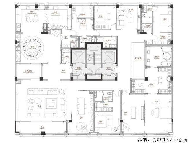 一期可售的户型面积集中在458-641㎡。当风貌平层户型尺度做到这个层面,其实户型本身已经无可挑剔了。仅说个细节,一期风貌平层中,做了罕见的做了两梯一户配置,主佣分离很好地保证了业主的隐私性和动线。