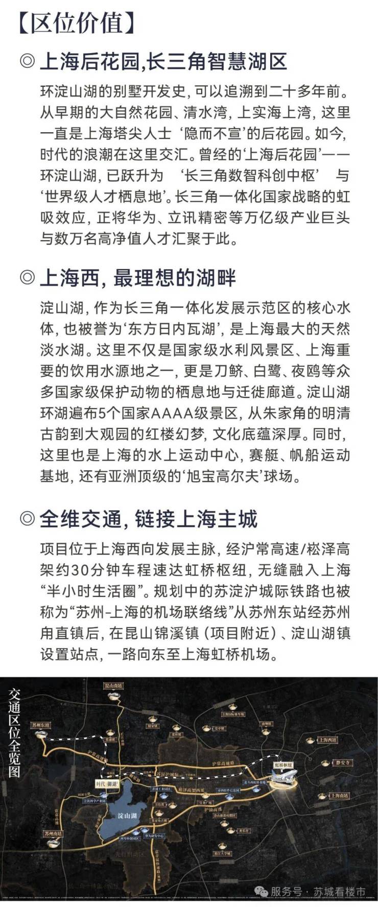 地铁交通:目前无地铁覆盖,可自驾10分钟到朱家角古镇商圈、万达茂商业,20分钟到青浦吾悦广场、宝龙广场大型综合体;公交站点锦淀路环湖大道站(136路、示范区6路)距社区约405米,通勤上海、昆山市区较便捷
