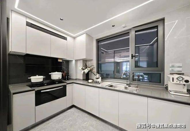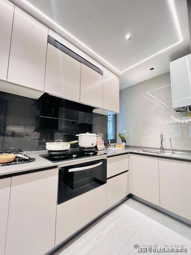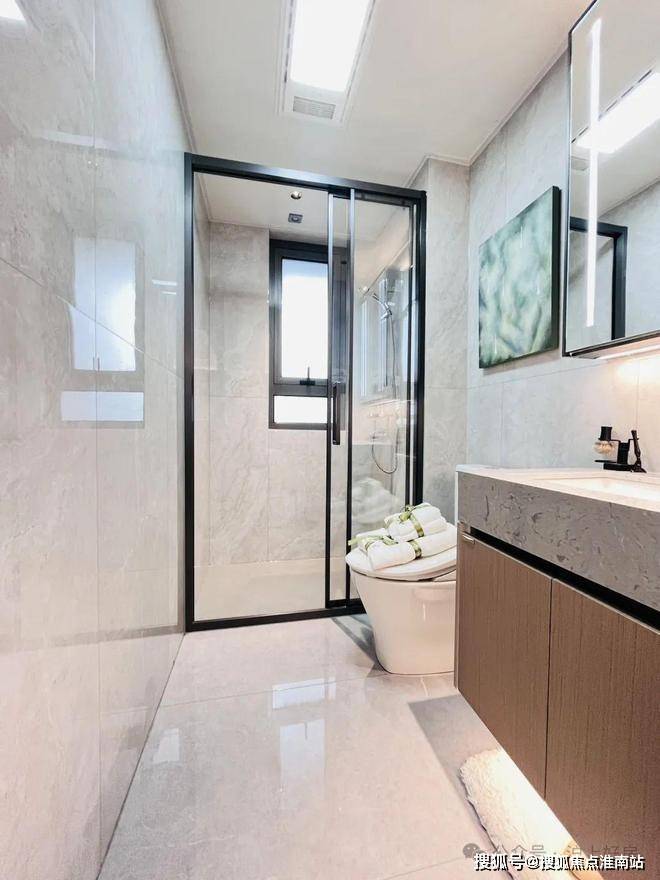 在细节上同样不遗余力。比如入户后的玄关柜是交付标准,打开厨房柜体、镜柜等各类收纳空间时均有惊喜;再如客厅和主卧均采用弧形吊顶,还有风暖浴霸、玄关顶面感应灯等细节,都透露出项目对品质生活的追求。