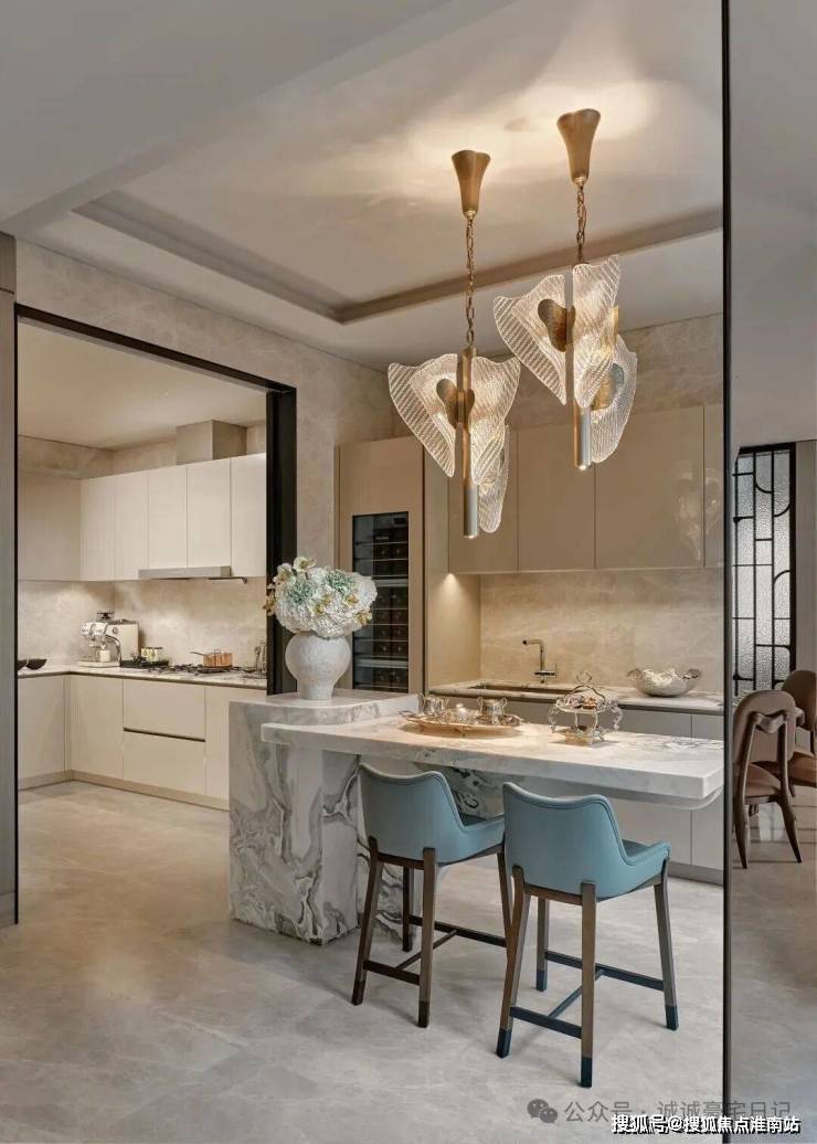 主厅核心区悬浮式定制柜体,银箔与丝绸在几何切割中构建中式基因,毕加索石材的天然裂变肌理成为天然艺术装置。瀑布吊灯以流体力学演绎东方留白,让光影在岩板表面生长出动态水墨意境。