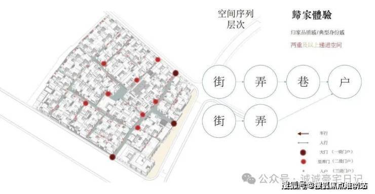 士林润园社区规划可分为蓬莱路城市公共景观以及社区内部景观两个部分,其中市政绿地衔接于上海2035城市总体规划中“蓝绿丝带”的上位条件要求,社区内部街巷空间形成空间序列形成递进的层次,将归家体验的序列依次展开,形成城市街道→入口(一级门户)→街巷→节点空间→里弄门(二级门户)→合院入户(三级门户)的方式,基本可保证大多数住户可体验到两重以上的空间递进。