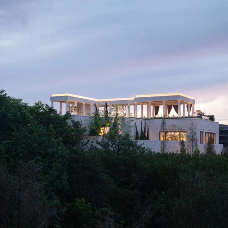 项目原始地形存在一定的高差,为打造生动、静谧的低密高端产品,营造桃园栖居生活的动人画卷提供了得天独厚的条件。溪径恒庐采用「台地式布局 + 垂直渗透」的复合规划策略,以「顺应地势、分层生长」为核心,将天然地形高差升华为社区的立体叙事,塑造出宛如“雅典卫城”般的场景体验。