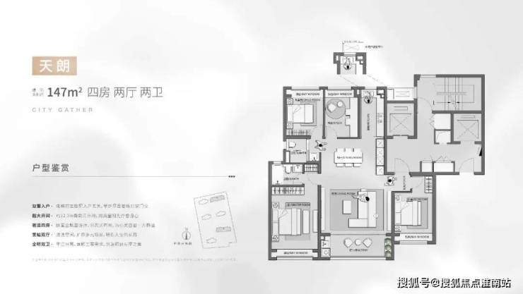 主力户型:建面约 147㎡、165㎡四房户型。其中,147㎡户型为 4 室 2 厅 2 卫,165㎡户型为 4 室 2 厅 3 卫。