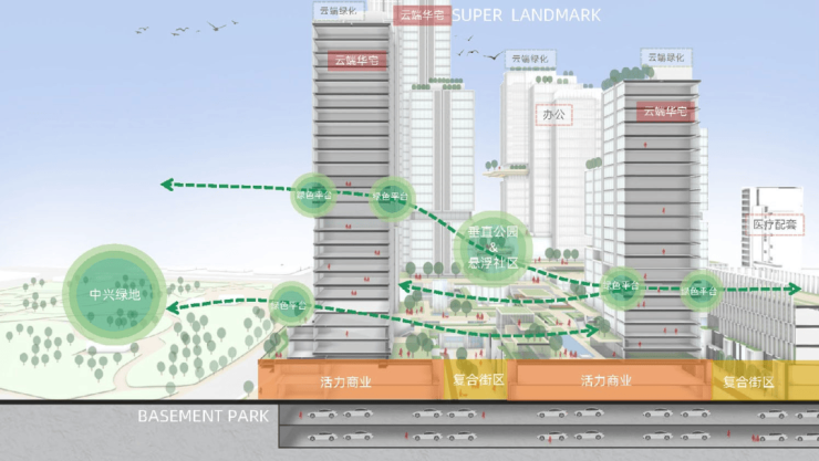 基于多维立体空间体系,打造复合创新型商业、办公、住宅空间,分为垂直复合的公园商业,地标级的公园办公,漂浮公园社区。