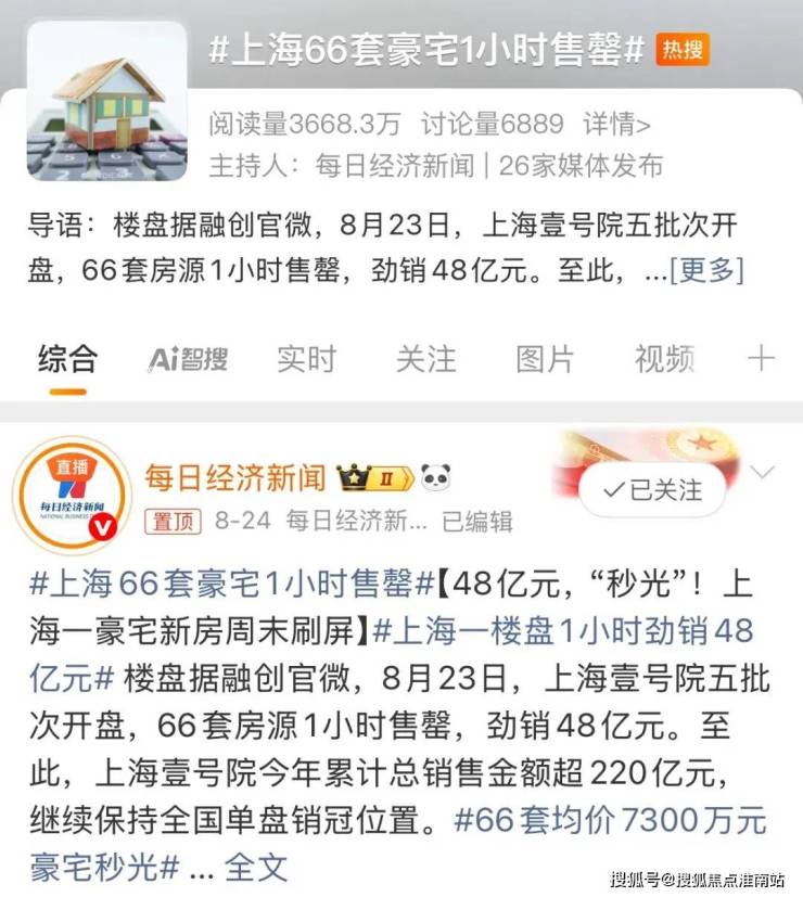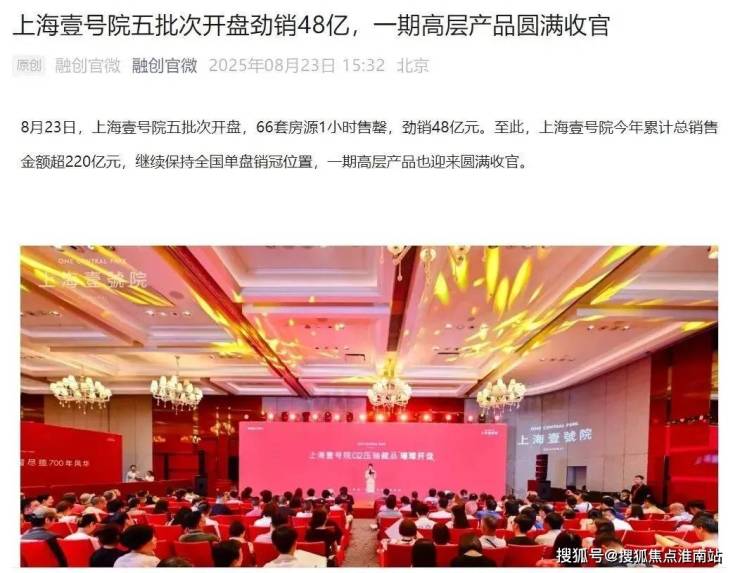 上海壹号院,五批次66套房源1小时售罄,均价19.8万元/平米,单日销售额 48 亿元。