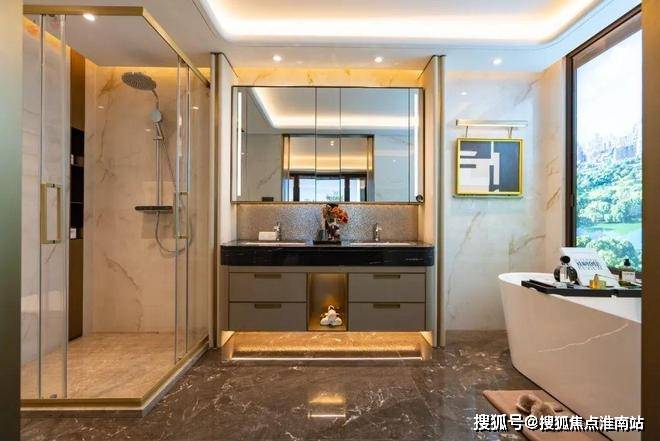 卫生间甄选 唯宝的台下盆、汉斯格雅的龙头+恒温花酒,玫瑰岛的淋浴房,科勒的智能一体马桶+浴缸+浴缸龙头等,生活质感肉眼可见。